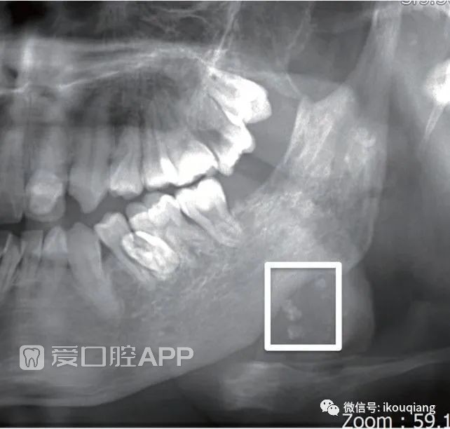 ▲图15 曲面断层片中左下颌角区数枚钙化团块