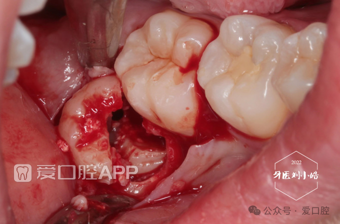 定位后冠部上方去除骨阻力后,于颊侧去骨至颊面外形高点稍下方并增隙。